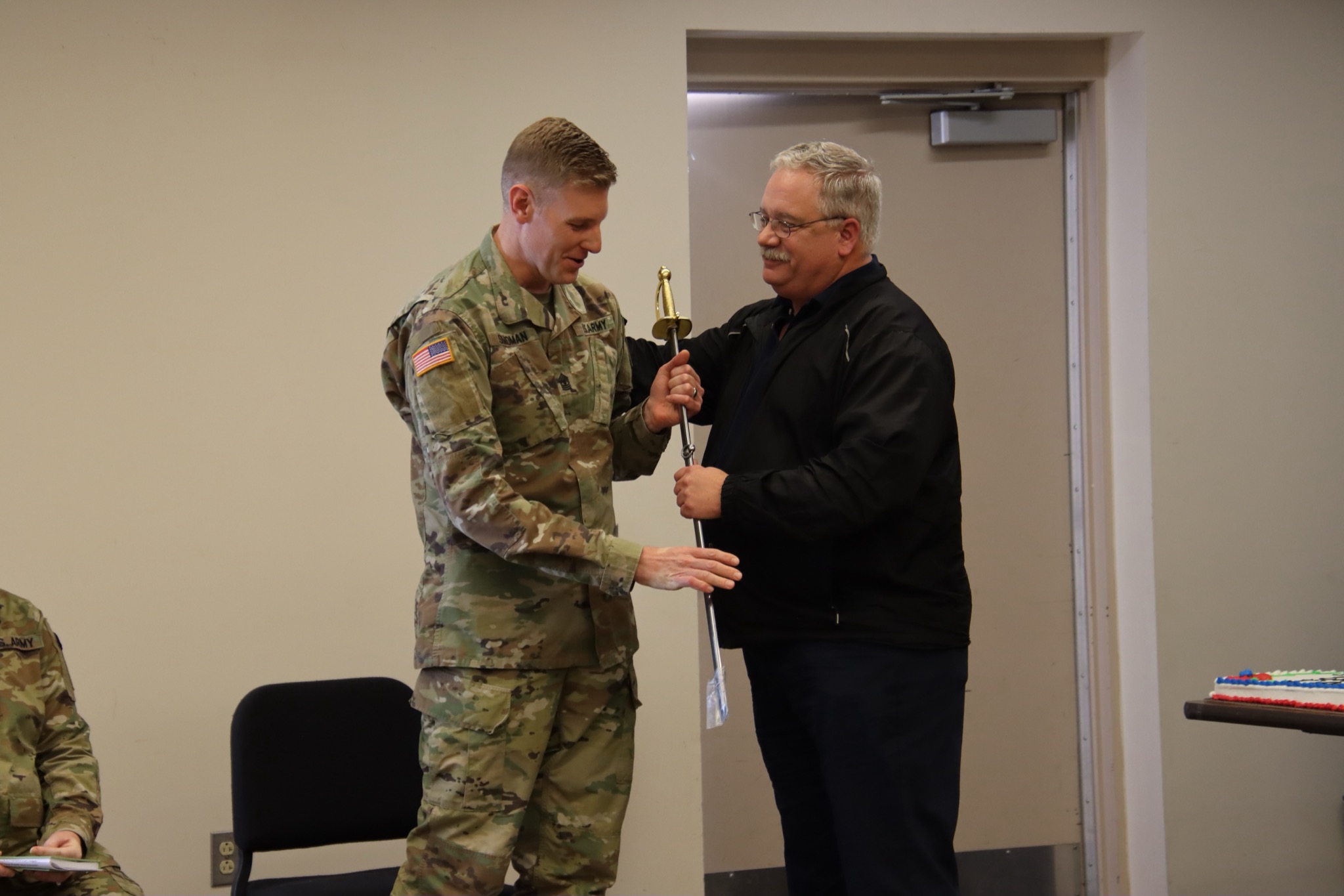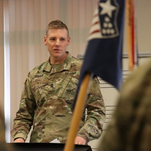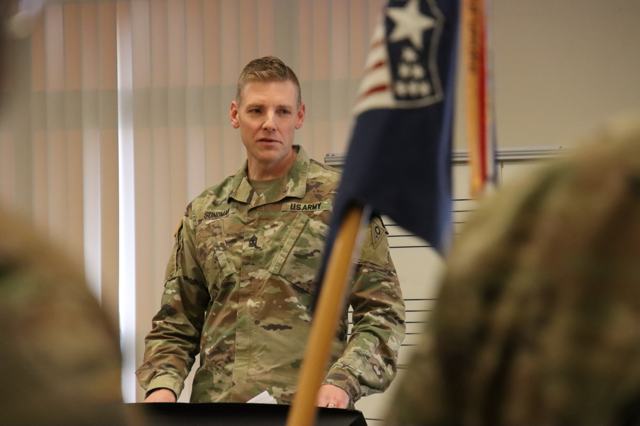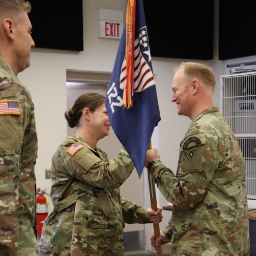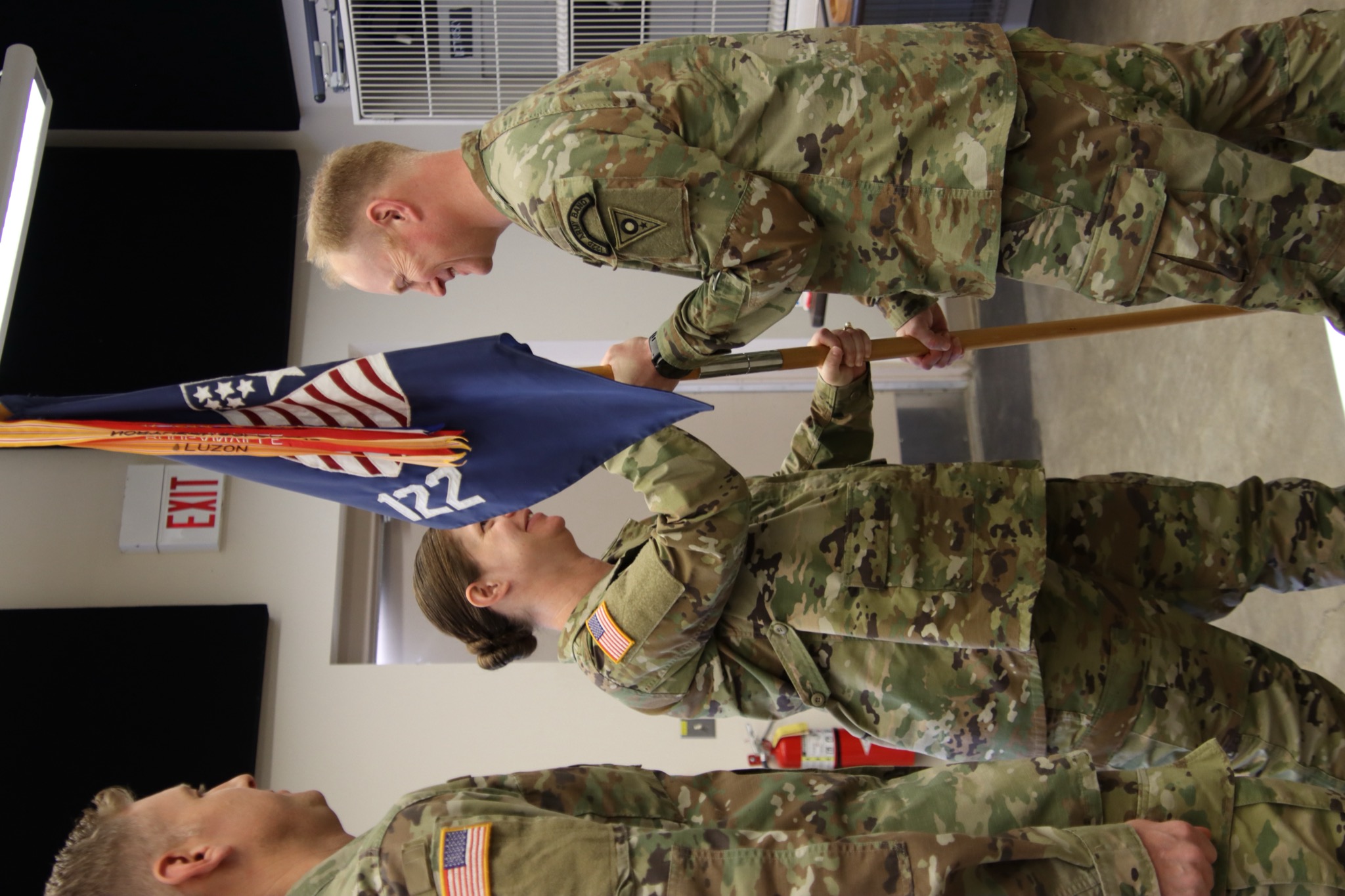 Rooted in centuries-old Army customs, the ceremony contains the symbolic passing of the unit's guidon flag, signifying the transfer of command responsibility from outgoing First Sergeant, 1SG Sundman to incoming First Sergeant, 1SG Huber. Guided by the hands of the unit’s leaders, including Commander of Troops, SFC Streem, and Commander, CW2 Emily Bauer, the exchange represented the unit's commitment to its mission and its soldiers under new leadership.